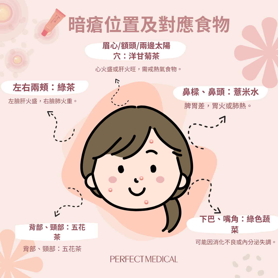 頸部暗瘡對應「荷爾蒙失調」;胸口暗瘡對應「肝、腸臟問題」;肩膀暗瘡對應「毛孔堵塞引發的暗瘡」;背部暗瘡對應「毒素積聚、膀胱濕熱」;手臂暗瘡暗瘡或是「缺乏維他命所致」;Pat Pat暗瘡對應「消化系統/久坐」。
