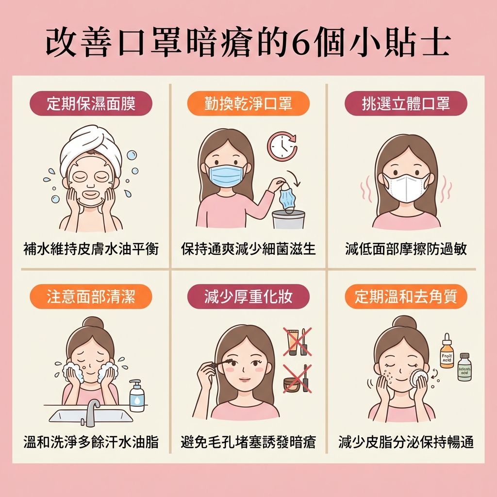 口罩暗瘡困擾不少女士,不過疫情之下又不能不戴口罩,如果真的不幸滿面紅腫痘痘,可以用以下4個方法改善口罩暗瘡: