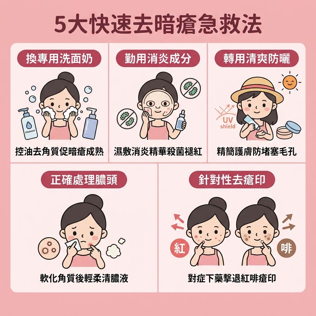 去暗瘡急救法—1. 先換上成分溫和補濕及具抗炎功效的洗面奶、2.早晚護膚時勤用消炎成分、3. 早上防曬程序換成乾爽防曬成分如礦物粉、4. 待膿頭完全成熟再擠出,處理膿頭不留印、5. 根據紅色暗瘡印、啡色暗瘡印對症下藥,針對性消除痘印。