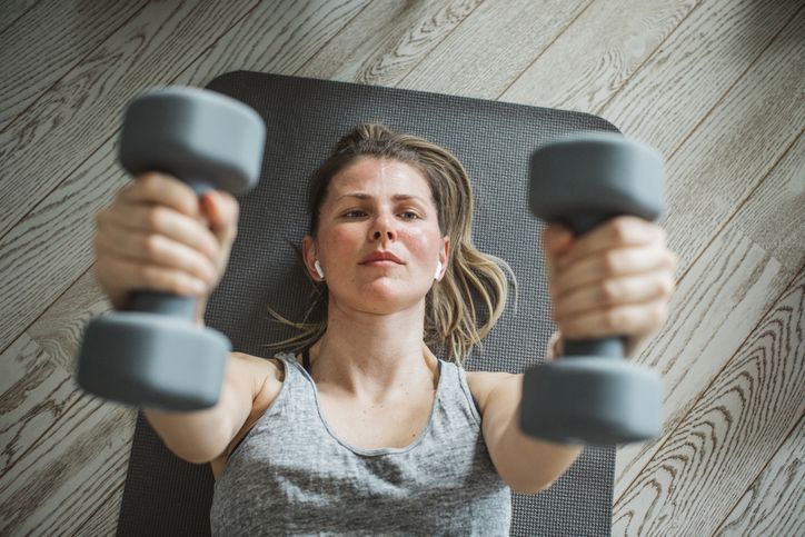 1. 在地板上鋪墊子或平躺於床上,背部平貼,盡量不要出現空隙。 2. 正握水瓶或啞鈴進行卧捱,呼氣向上推直手臂完全伸直,吸氣向下放。 3. 注意動作要緩慢,不要聳肩也要放鬆手臂跟指掌,進行15次一組,大概3組。