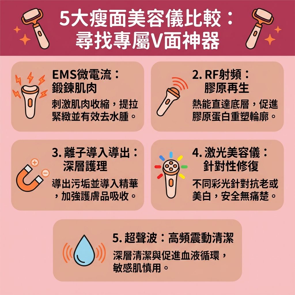 市面上的瘦面美容儀有各種不同的類型,亦常見到有不同的家用美容儀推介,其所用的採用的技術也將有所不同。