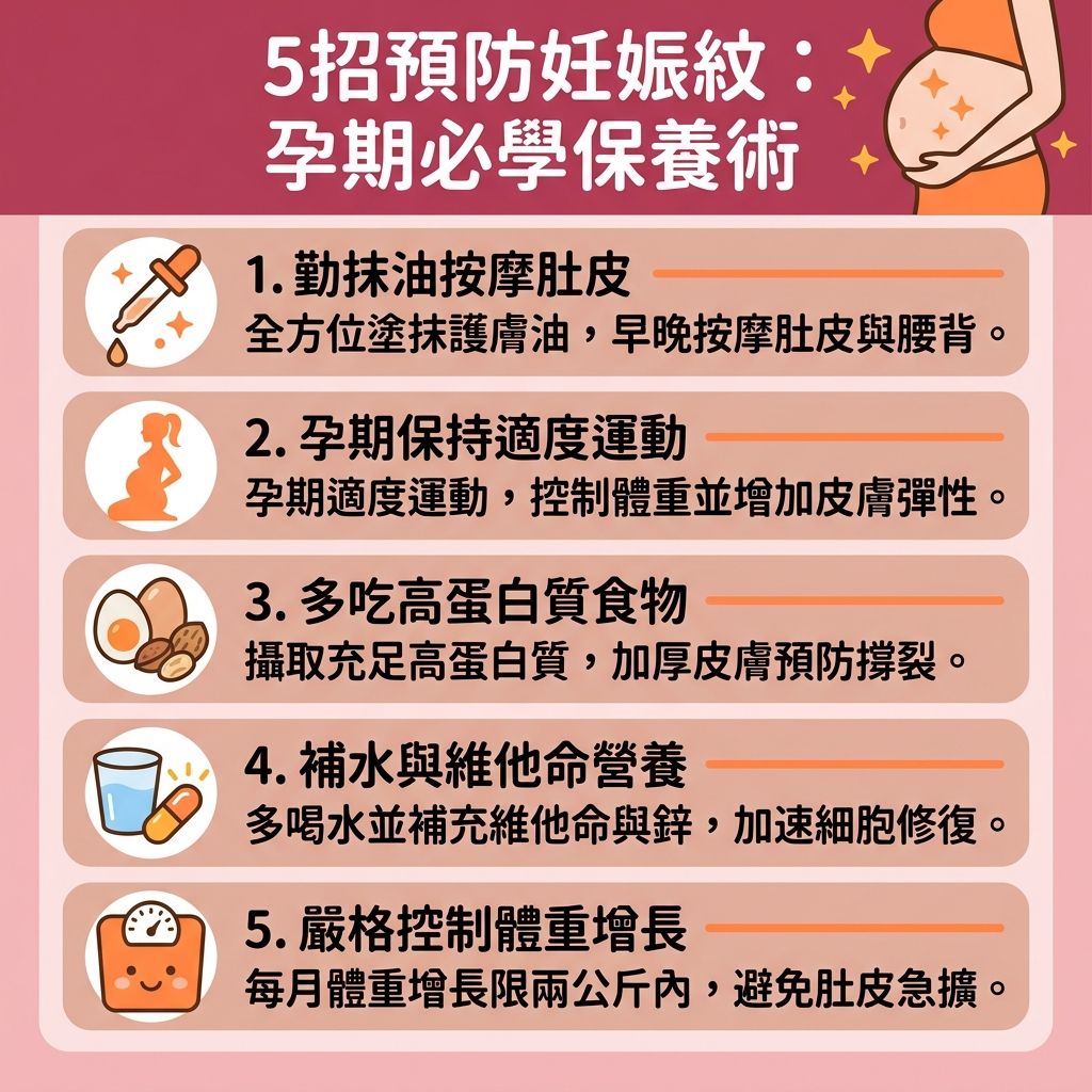 預防妊娠紋的7大方法:1. 以成分天然及簡單的植物精油按摩肚皮及腰側;2. 在懷孕期間進行適量的孕婦運動或瑜珈;3. 多吃蛋白質:增長肌肉、皮膚的厚度及彈性;4. 補充維他命C及維他命D:維持較高的維他命D水平可預防妊娠紋出現,維他命C有效增生膠原蛋白及加快肌膚修復;5. 攝取鋅:鋅具減輕皮膚炎症及加速傷口瘉合的功效;6. 補充大量水分:天天補充足夠水分能令皮膚細胞維持活力,保持肌膚柔軟健康;7. 每月體重不增加多於2Kg:讓皮膚有時間慢慢延伸、預防妊娠紋出現。消除妊娠紋的7大方法:1. 專家認證改善妊娠紋的3種最有效成分:處方級視黃醇(只在產後及非哺乳期才能用)、矽酮及透明質酸。2. 不要抓肚皮以免加劇皮膚撕裂情況,應塗抹乳霜為肌膚鎮靜補濕;3. 補充膠原蛋白:足夠的蛋白質及維他命A、C、D及鋅等有助肌膚膠原蛋白增生;4. 注意洗澡水溫:熱水會令肌膚更加乾燥及痕癢,甚至誘發濕疹;5. 椰子油+砂糖磨砂法:以適量椰子油與細砂糖混合,再加入一點點檸檬汁,以掌心打圈模式按摩肚皮,每次不要超過10分鐘;6. 孕後利用運動減肥:用節食、斷食方式極速減肥恐加劇妊娠紋,減肥配合運動有效修復腹直肌分離及收緊肌膚,避免出現腰間贅皮;7. 激光去妊娠紋/微針去妊娠紋:可刺激膠原蛋白增生及加快肌膚新陳代謝,或能改善減淡妊娠紋。