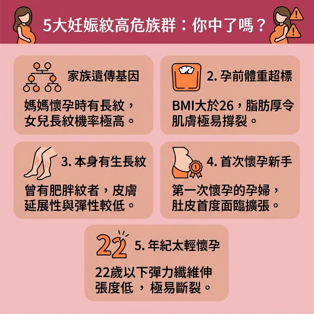 1.遺傳因素:受種族及家族基因影響,若你膚色較白或你的媽媽懷孕的時候具有妊娠紋,你也十分可能出現妊娠紋;2. 肥胖,BMI指數超過26:本身屬於肥胖超重人士,曾快速減肥或快速增肥;3. 有橙皮紋或生長紋:表明肌膚延展性較低,很大機會會出現妊娠紋;4. 第一次懷孕或22歲以下懷孕:年輕媽媽的肌膚膠原蛋白及彈力纖維的伸張度不夠,因此真皮層斷裂的機會較高。