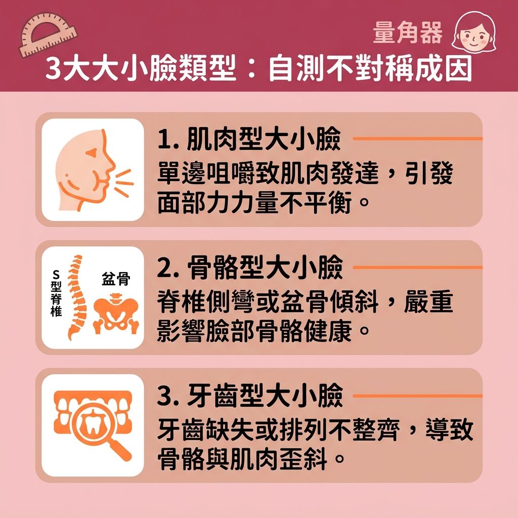 大小臉大致可分為:肌肉型、骨骼型和牙齒型。肌肉型的大小臉是指左右面的肌肉力量並不平均,某邊臉部的肉比較發達,一般都與跟咀嚼習慣和飲食習慣有關。另外經常用單邊咀嚼,會促進另一側的面部肌肉和頜骨萎縮,導致兩邊臉型大小不一致。至於骨骼型的大小臉脊椎側彎、盆骨傾斜等因素有關,骨骼疾病也是造成大小臉出現的一個因素,如骨纖維異常增殖症等,還有脊椎和盆骨出現問題,都會影響臉部的骨骼健康,導致臉部從嘴巴開始傾斜,同時造成鼻歪、高低眼及半邊太陽穴凹陷等問題,大大影響外觀。最後天生擁有牙齒缺失、掛列不整齊等問題,都會令臉部的骨骼出現歪斜,使面部肌肉不平均,導致臉型不整齊的情況。