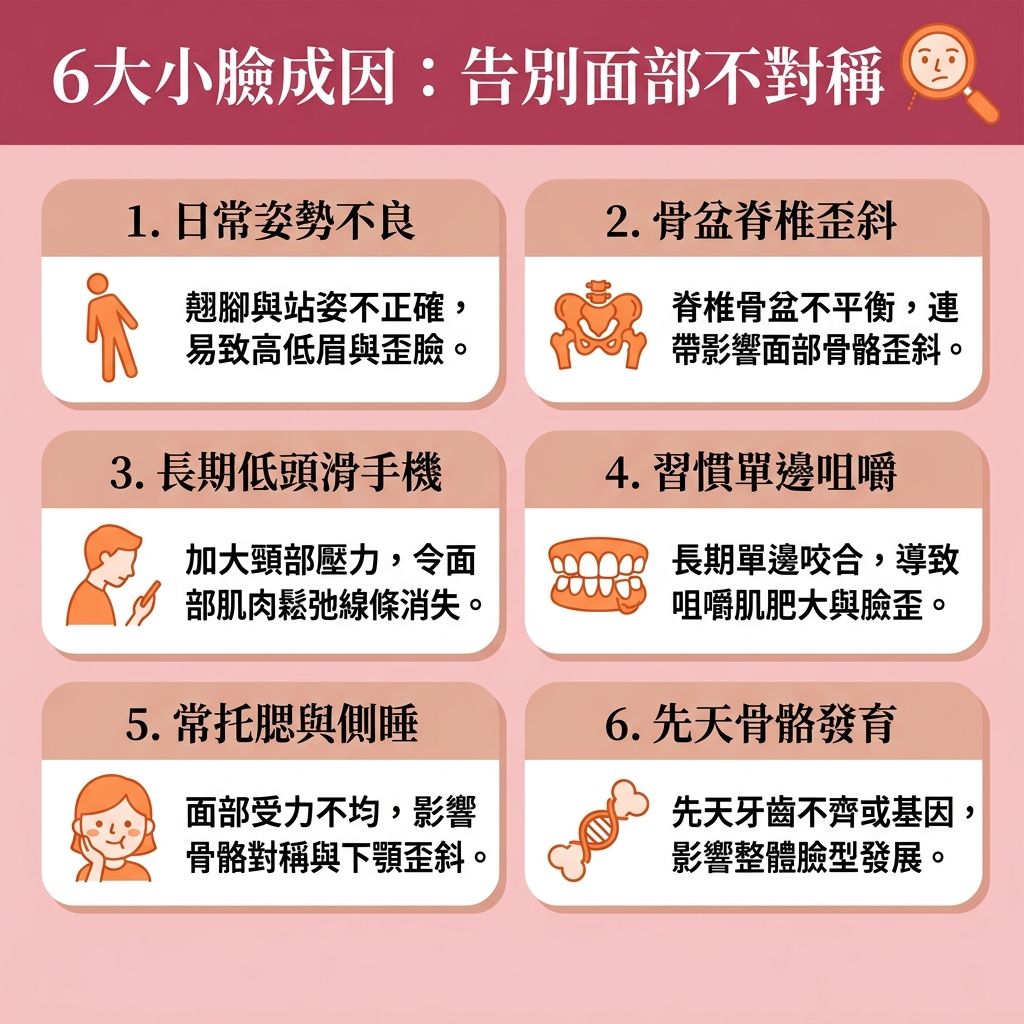 姿勢不良、習慣單邊咀嚼和喜歡托腮側睡,都會影響到臉型不平衡,例如喜歡翹腳、不良的站姿,經常低頭看手機,長時間這樣做會導致整塊臉部受力不平均,影響臉部骨骼的不對稱,頸部承受的壓力較平常更大,而且臉部肌肉和臉部線條也因而漸漸消失不見,久而久之都可以造成明顯的大小臉、歪鼻、高低眉等等的問題。除此之外,脊椎側彎、骨盆歪斜都可以造成大小臉,脊柱作為人體最重要的器官,如果出現歪斜,就可能造成不同的身體問題,例如高低肩,腰痛、高低腳。另外脊椎出現側彎的人士,盆骨自然也會有歪斜的問題,當盆骨發生傾斜、旋轉等問題,就會令整體姿勢歪向某一邊,使整個站姿和坐姿歪向一邊,在地心引力的影響之下,臉部會歪向一邊,使臉部不對稱!
