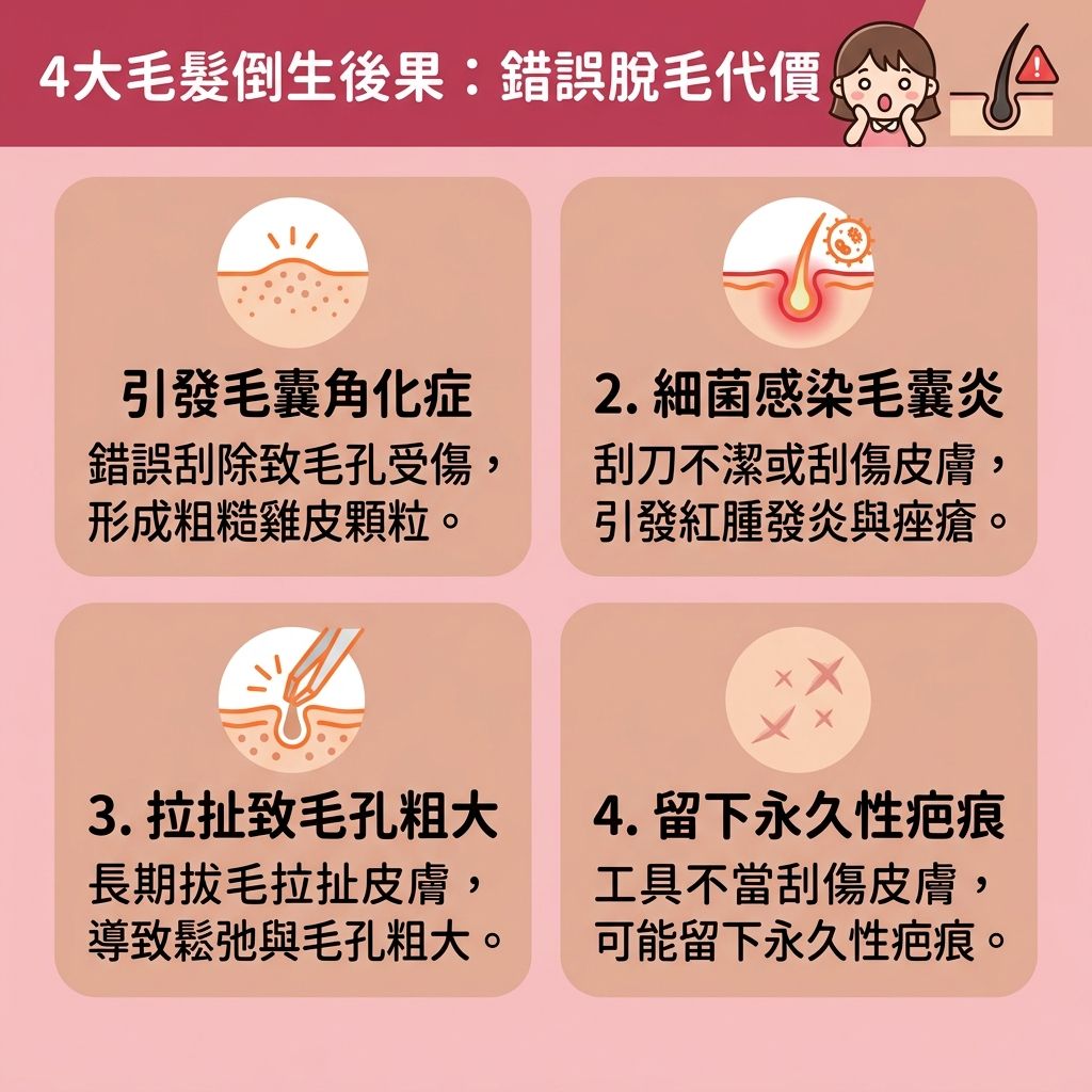 在脫毛的時候,使用脫毛工具例如脫毛刀、手動拔毛,過程中如果手勢不佳,有機會會刮傷皮膚,而最嚴重的情況還可以引至皮膚表面處疤痕形成。