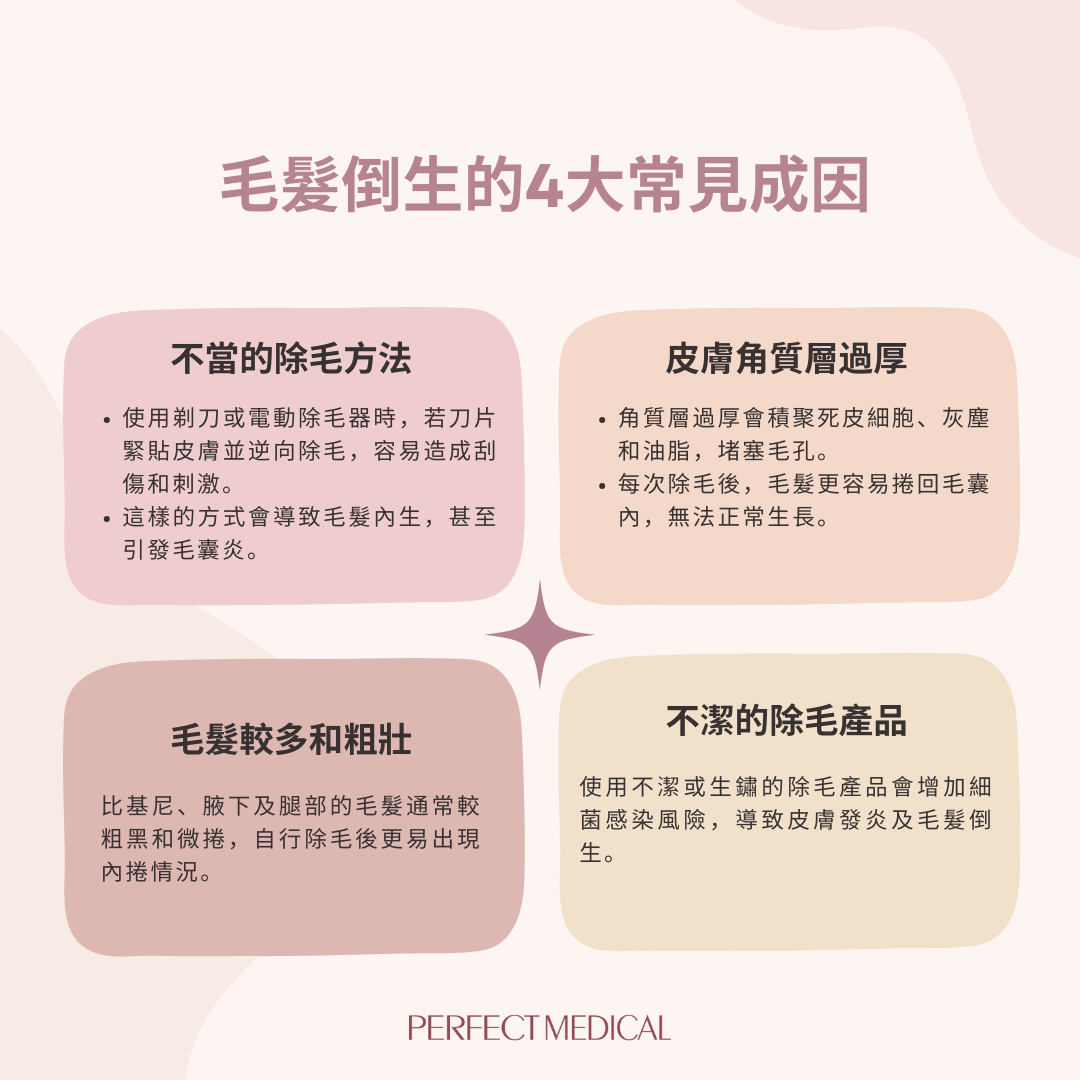 毛髮倒生的原因主要是由於不當的脫毛方式引起,把剃刀的刀片或電動除毛器緊貼皮膚,很容易會刮傷????刺激皮膚,嚴重還可以導致毛髮倒生,引發毛囊炎。另外如果皮膚角質層過厚,表皮充滿死皮細胞、灰塵和油脂,每次除毛過後,亦有更大的機會導致毛髮捲回毛囊內部,形成毛髮倒生。最後使用不潔的除毛產品,在脫毛時很容易因為細菌入侵而導致皮膚發炎,形成毛髮倒生。
