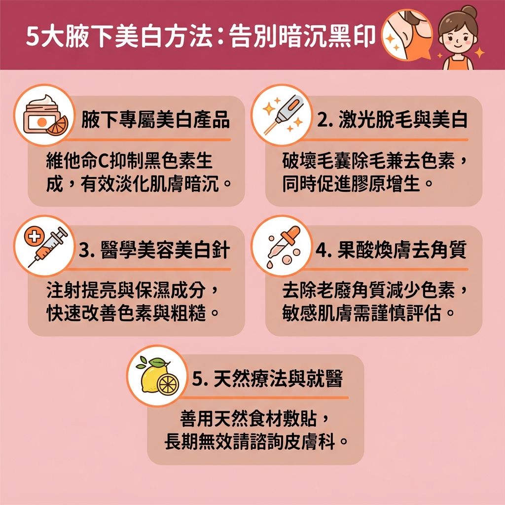 腋下美白產品包括維生素C腋下美白霜、腋下美白膜等。維生素C能夠抑制黑色素的生成和淡化已有的黑色素,減少腋下皮膚暗沉,所以在很多美白產品當中可以見到此成分。美白膜則是建議一星期使用一到兩次,其成分比美白霜更容易滲透進肌膚,另外也有人使用淡斑霜來淡化腋下的黑色素。然而,盡量避免用搽臉的產品去搽腋下,也要確保腋下美白產品適合個人膚質,可以在耳朵後方或手背皮膚進行測試,若無敏感反應才繼續使用。