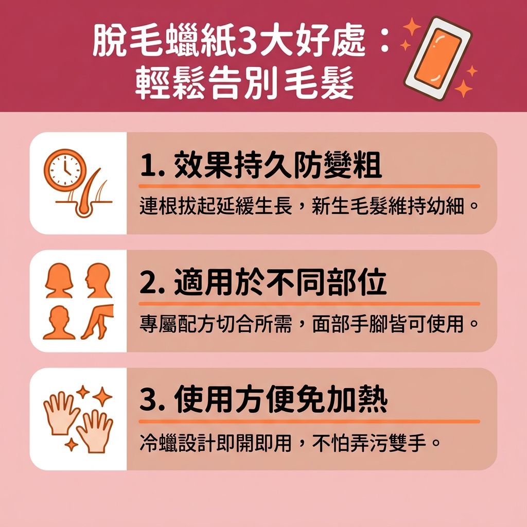 由於脫毛蠟紙可以將體毛從從毛囊中連根拔起,因此脫毛時會令一整條毛髮完全脫離,比起使用剃刀、脫毛膏等脫毛方式,只能只凸出皮膚表面的體看去除,脫毛蠟紙的脫毛效果會更為持久,體毛需要更長時間才能長出。另外,將毛髮連根拔起的話,有別於把體毛從平面切除,每次重新長出的毛髮尖端都能夠維持幼細,不會出現毛髮「越變越粗」的問題。