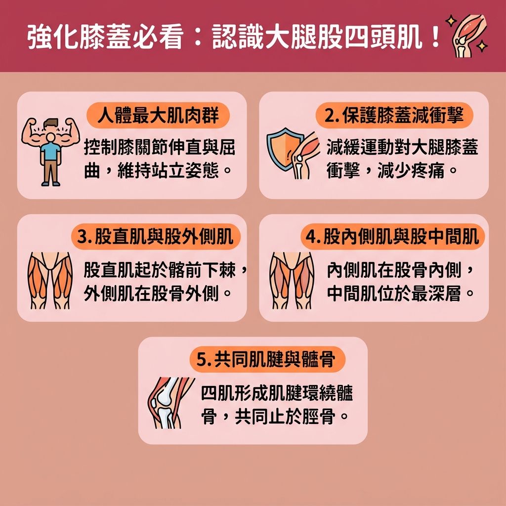 股四頭肌位於人大腿前側肌肉,是人體上最大與最有力的肌群,並由股直肌、股外側肌、股內側肌與股中肌四個肌肉群結構而成。當股四頭肌收縮時,會拉直膝上的肌腱使小腿伸直,並控制大腿膝關節伸直與屈曲髕關節,維持人體站姿或直立的姿勢,同時也是主要控制人們在日常生活中跑步、跳躍與行走的主要肌肉。