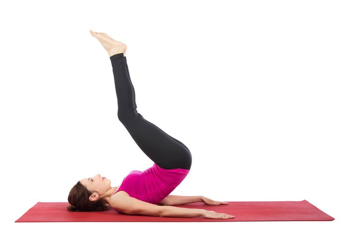 1. 躺在地板上,雙手心向下平放於身側,微抬起雙腳並微屈膝。 2. 慢慢伸起雙腳,直到雙腳完全伸直指向天花板,肩胛骨以下部分完全離地。 3. 收緊腹部,不要讓身體搖晃,想像把骨盆往胸部的方向推,肩膀不要聳起,上半身呈放鬆狀態。