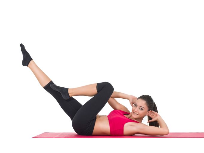 1. 躺在地板上,雙手貼在左右邊太陽穴,或是十指交握置於腦後。 2. 雙膝微彎,利用腹部的力量扭動側腰,用右手手肘去碰左手膝蓋、用左手手肘去碰右腳膝蓋。當一腿屈膝的時候,另一腿伸直。 3. 注意伸直的腳不要碰到地板,腹部要用力收緊,中背貼緊地板,盡量不要晃動身體。