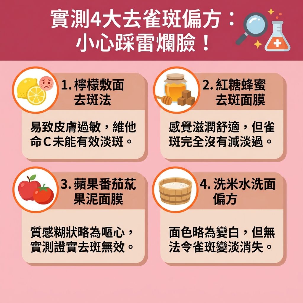 剛才提到雀斑會隨着年齡增加而愈生愈多,若不及早進行保養,肌膚就有機會急速老化。坊間有各式各樣的去雀斑方法,如果雀斑數量不太多,可先進行簡單的DIY去雀斑偏方,相信可改善輕微的雀斑問題。