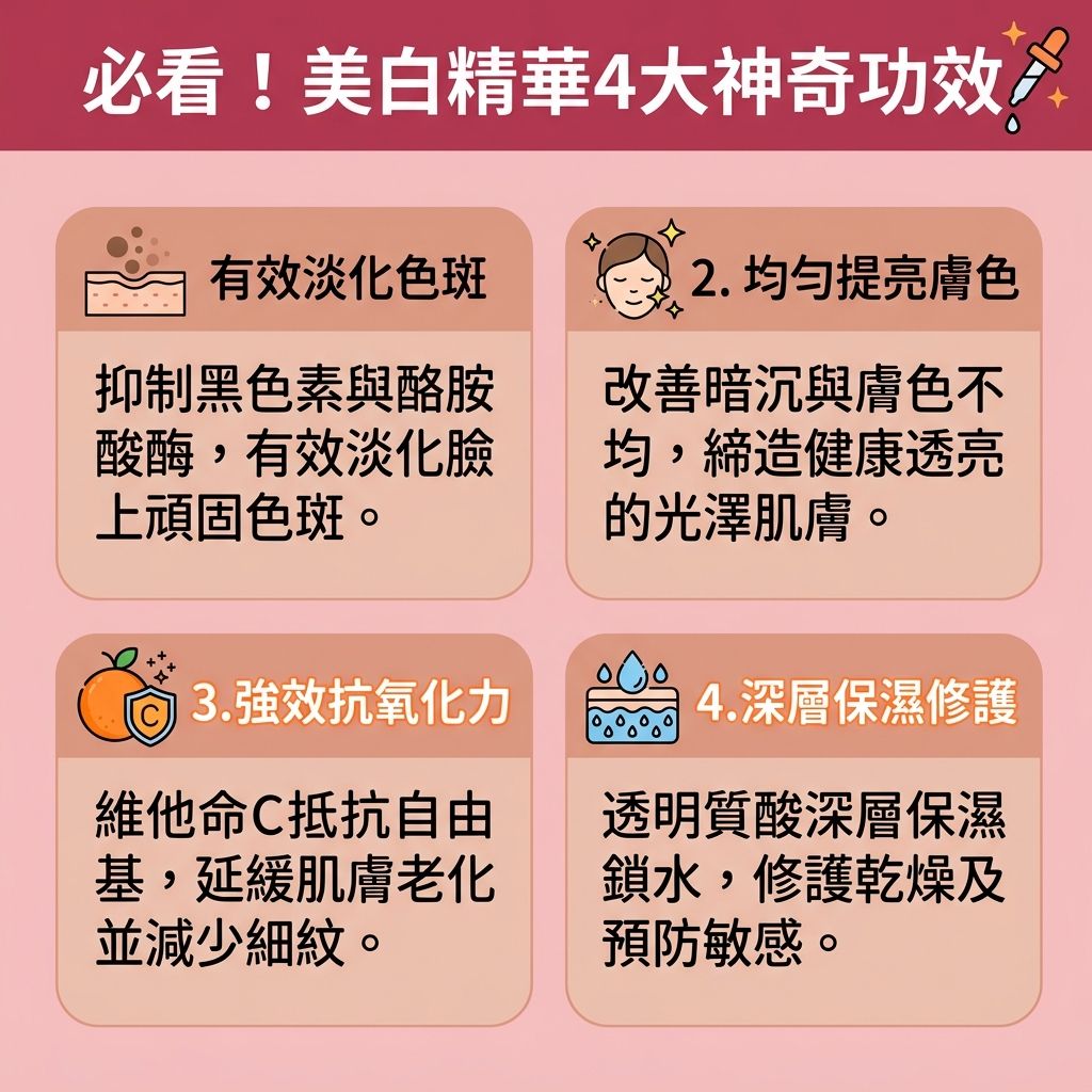 美白精華無法根治深層色斑(如黃褐斑),只能作為輔助預防。淺層色斑通常需要持續使用3個月才能看到顯著提亮。深層色斑必須透過專業激光療程才能有效擊退。
