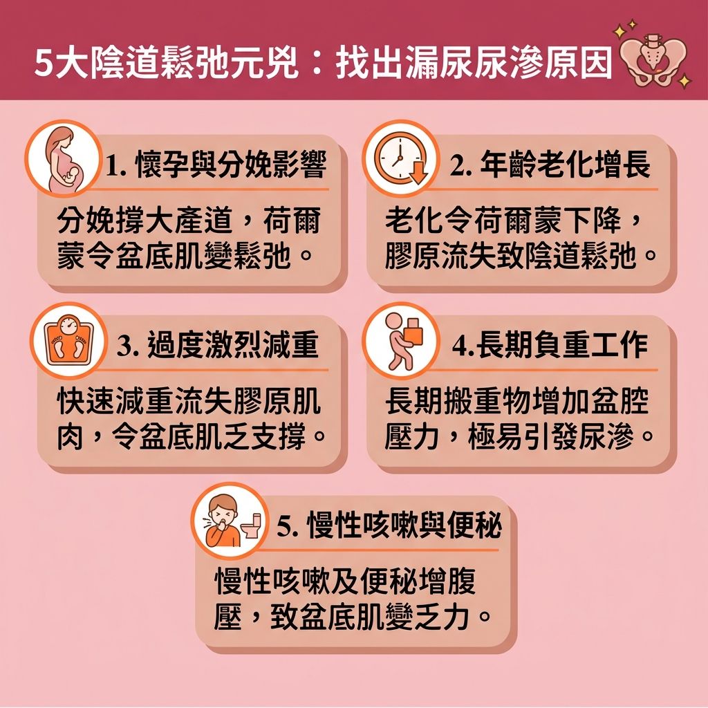 懷孕分娩、年齡增長和雖度減重都會令到女性的盆底肌變弱,使得膀胱的控制能力減弱,繼而形成尿滲、尿頻等的情況。女性在懷孕和分娩時身體內的荷爾蒙會產生很大的變化,如如果胎兒頭部較大,胎兒經過產道時,陰道被過分地擠壓撐大,即使是分娩過後,陰道也很難回到原先的緊緻。另外隨著年齡增長,人體自然老化是不可逆轉的現象,陰道黏膜及盆底肌也一樣,當年齡增加,荷爾蒙會隨之而下降,而膠原蛋白也會日漸流失,從而令到陰道黏膜變得薄弱、萎縮和乾澀,也會令到陰道變得鬆弛。最後如果女生過度減重,體重在短時間內快速地下降,也會導致陰道鬆弛!這是由於在激烈的減重時期,身體的膠原蛋白、蛋白質也會快速地流失,使得陰道變得不再緊緻!除此之外,快速減重往往第一時間減掉的只會是身體多餘的水分及肌肉,反而不是脂肪,當下半身失去肌肉過後,也可能會令到骨盆底支撐不足,進而造成骨盆底鬆弛。
