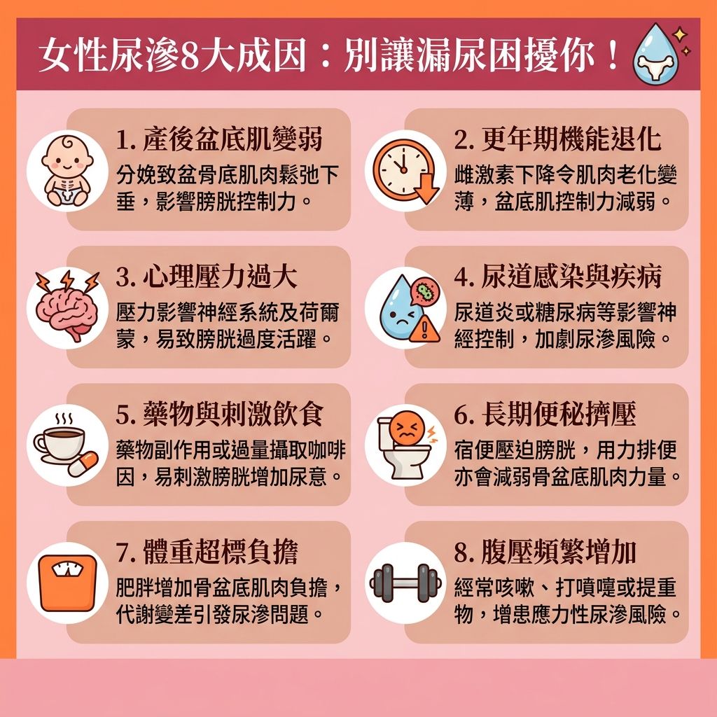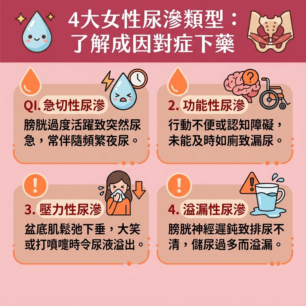 常見於:中年女性、懷孕女士 徵狀:咳嗽、打噴嚏、搬動重物、大笑等動作都會引致尿滲。
