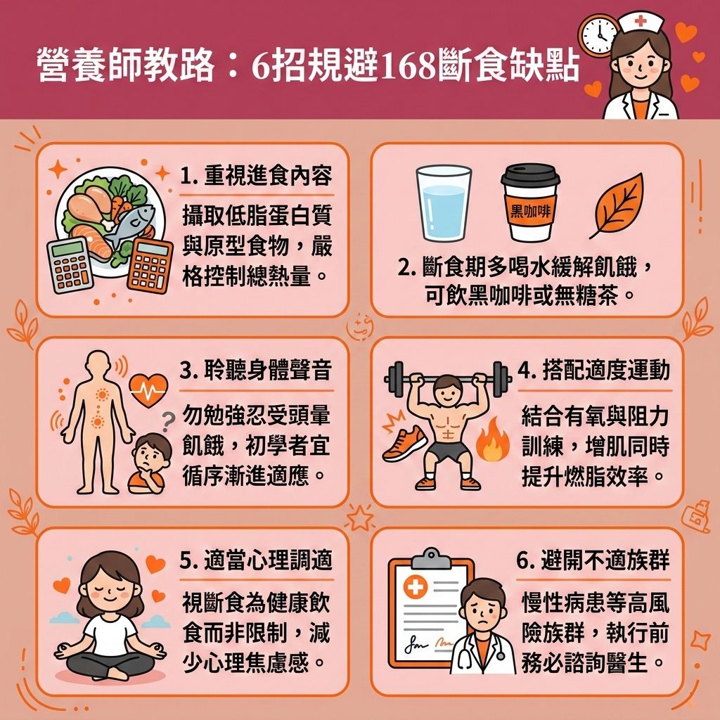 面對168斷食缺點,專業營養師如李婉萍常強調關鍵在於「正確執行」與「了解自身」。要規避168斷食的風險,並最大限度地發揮其減重效果,需要以下策略: