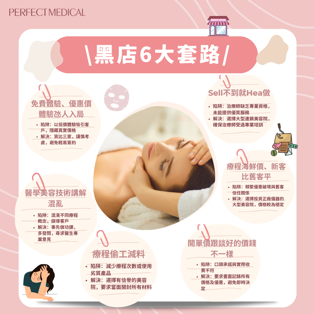 海鮮價及隱藏收費:價格因不同人而浮動,而且儀器配件或須單次購買;2. 療程一再「加碼」:當用家發現療程效果不理想時,美容院可能會要求用家買其他療程,致使金額愈滾愈大;3. 先確定信用卡分期付款可以免息:「免息分期付款」要獲該金融機構批核,因此在付款前必須先問清楚發卡機構;4. 簽約後難維權追討:在想清楚之前切勿簽約及付出金錢,不然日後維權及追討款項將會十分困難,付出的錢如潑出的水。