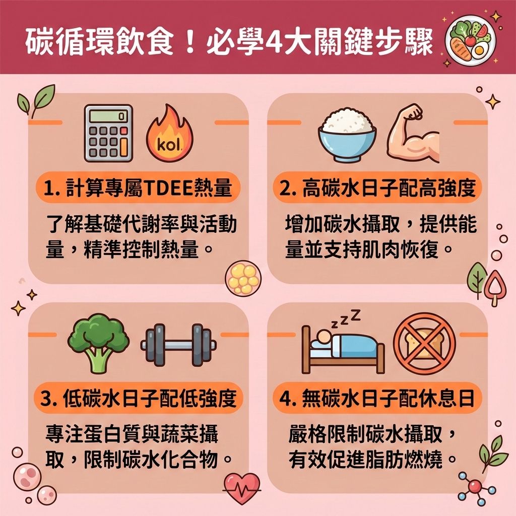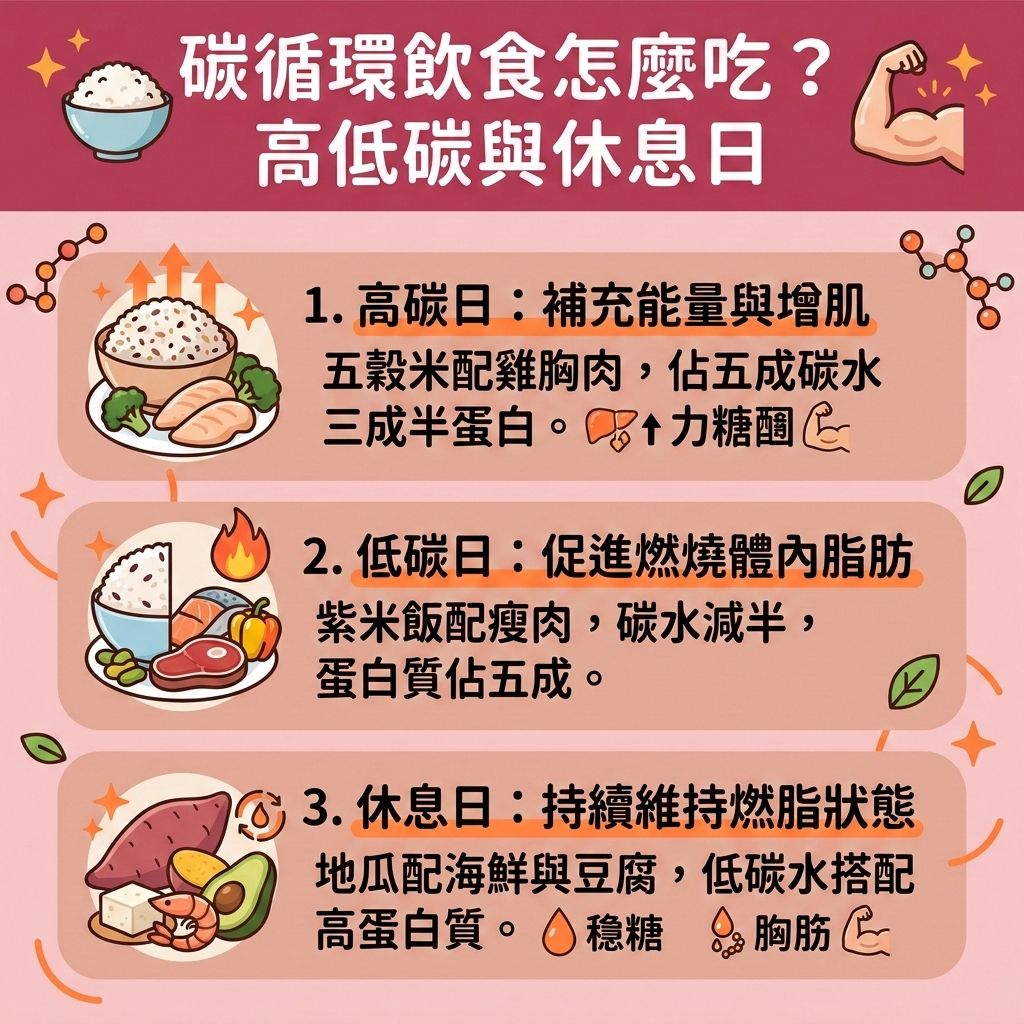 碳循環飲食將你的飲食分為高碳日、低碳日和休息日3個階段,依照不同訓練強度和類型來調整。在高碳日,適合進行高強度運動和重量訓練;在低碳日,主要進行低強度訓練和心肺有氧運動;而休息日,也被稱為無碳日,碳水化合物的攝取應被控制在30克以下,類似生酮飲食的原則。