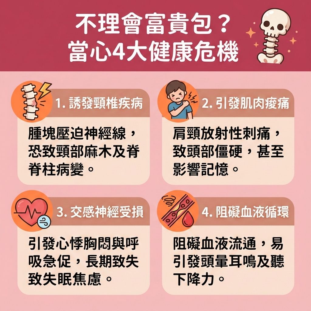 富貴包增生雖然從外在看來只是凸起一個腫塊,但在肉眼不可見的皮膚底下,囤積的脂肪或錯位的骨骼是有能力壓迫神經線的。被施壓的神經線會讓頸部肌肉變得麻木,疼痛感可以延伸到整個上半身,若是患上輕微的頸椎病還算小事,能夠利用現代醫學科技緩解,但若是影響到脊柱健康,惹上脊椎病可就沒有那麼容易解決,再嚴重一點甚至有半身不遂的可能!
