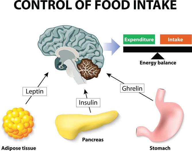 瘦素是由脂肪細胞分泌的一種肽類激素,編碼基因被稱為肥胖基因(ob gene)。作為體重控制的核心,瘦素在血液中的濃度與脂肪量成正比,它會穿過血腦屏障進入中樞神經系統,直接作用於下視丘。瘦素是脂肪組織向大腦發送的飽足訊號,透過抑制進食量,並增加能量消耗,讓身體維持在穩定的體重範圍。
