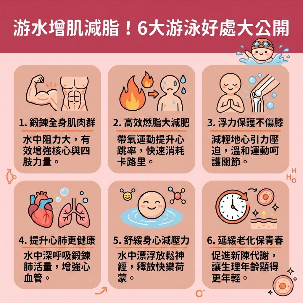 總的來說,這種獨特的運動方式不僅有助於減肥,還能激活每個細胞,促進心血管健康,甚至在淋浴和梳洗之後,仍然能繼續促進新陳代謝。此外,游水增加身體的柔軟度和提高協調性,讓你感覺更年輕、更健康。作為一種低衝擊的運動,游水適合各年齡層的人們,無論你是游水愛好者還是初學者,年輕人還是老年人,都可以從游水中獲得健康益處。這種多合一的運動方式讓你在一個活動中獲得多重好處,無疑是個非常明智的運動選擇。