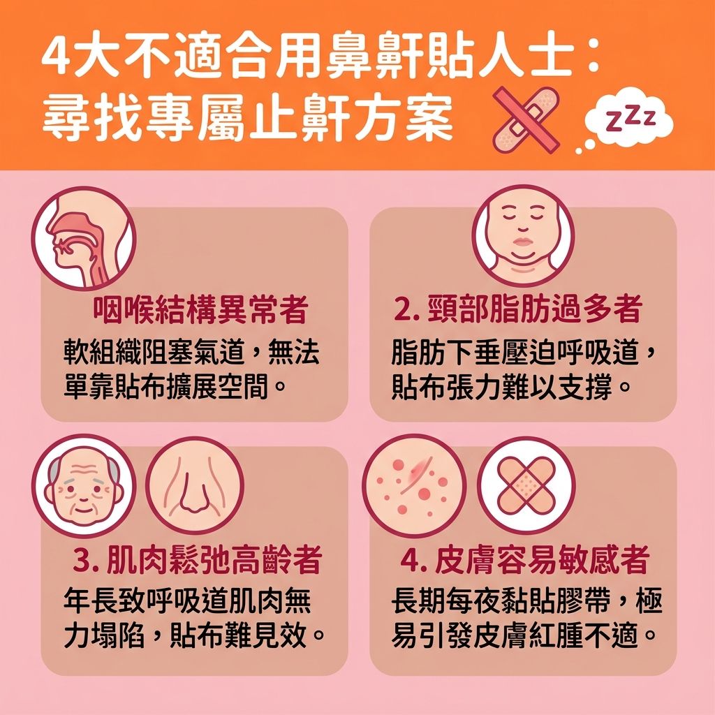 因鼻鼾貼是通過擴展鼻腔空間或強制人們合口睡眠來緩解鼻鼾症狀,因此不推薦肥胖者,高齡人士,咽喉結構異常者使用。此外,此產品需緊貼皮膚,且需每夜使用,因此皮膚敏感者亦不宜使用此產品。