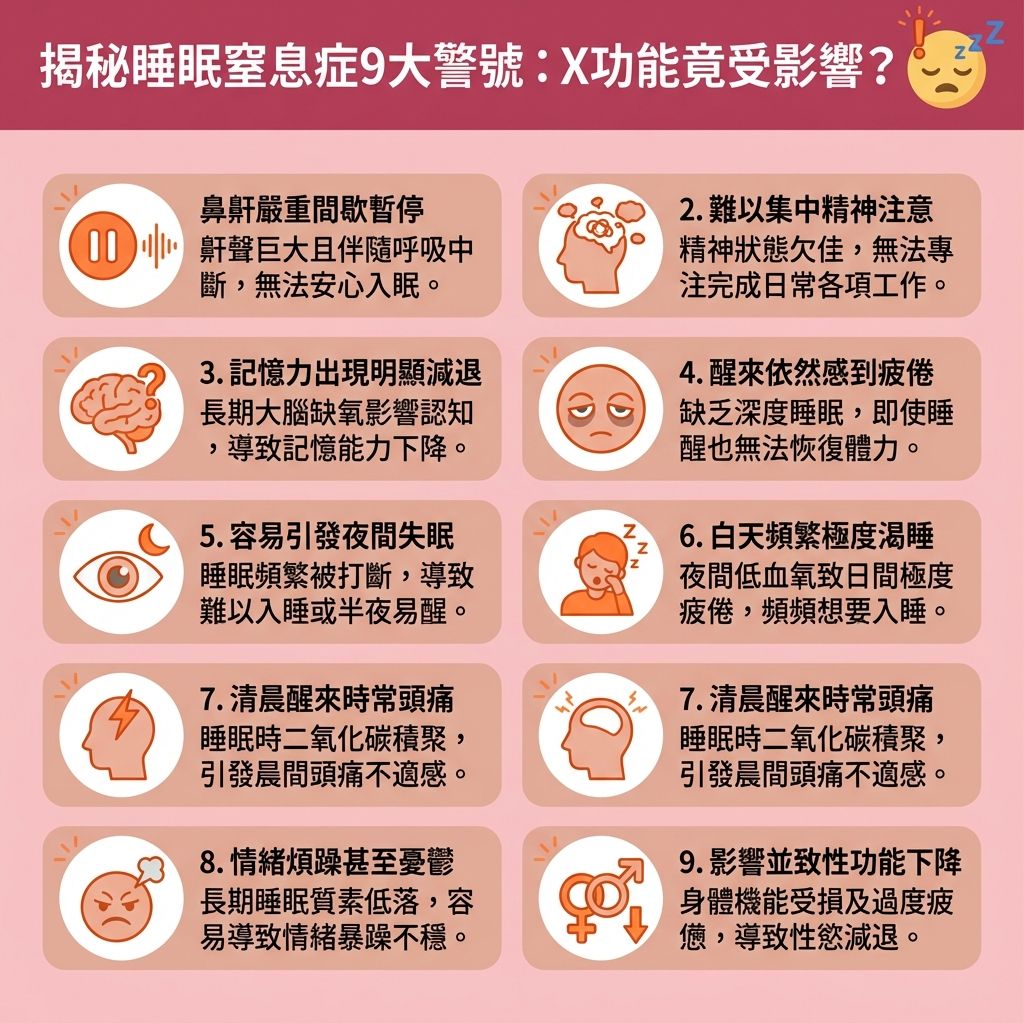 1. 嚴重鼻鼾,卻會間歇性暫停 2. 難以集中註意力 3. 記憶力減退 4. 醒來後依然感到疲倦 5. 夜間失眠 6. 白天頻繁想要入睡 7. 清晨醒來時頭痛 8. 情緒煩躁、憂鬱 9. 性功能下降