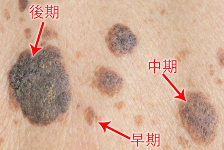 2. Patches resembling age spots but with uneven color, rough texture, peeling, or persistent wounds. These could be signs of actinic keratosis — an early form of skin cancer often mistaken for age spots.