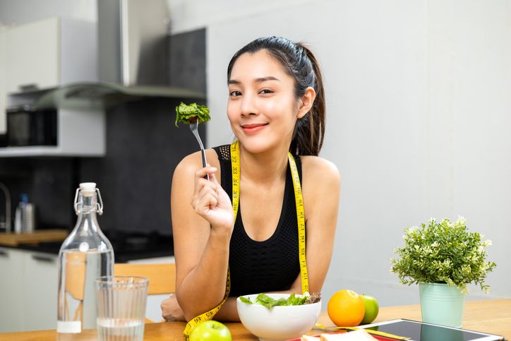 A healthy diet helps you keep track of how many calories you eat. When you eat more calories than your body needs, your body stores the extra energy as fat. By eating a healthy diet, you can control how many calories you take in by eating the right amount of food. This keeps you from eating too many calories and getting fat as a result.